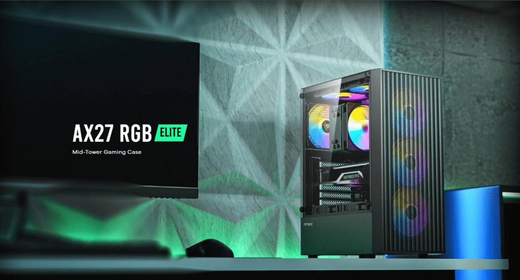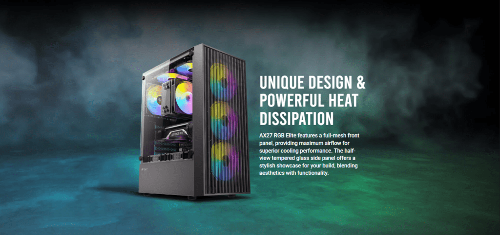 The Antec AX27 Elite is a premium mid-tower gaming case combining style, cooling efficiency, and expandability. Its tempered-glass side panel and ARGB lighting showcase internal components, making it ideal for gamers and custom builders who want both aesthetics and performance.