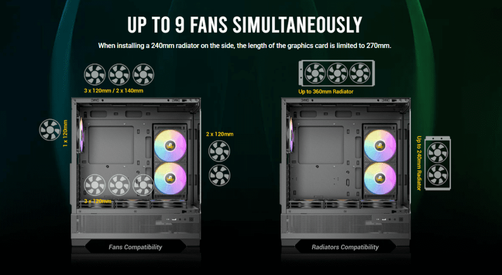 • Flexible cooling support: front 360 mm · top 240 mm · rear 120 mm