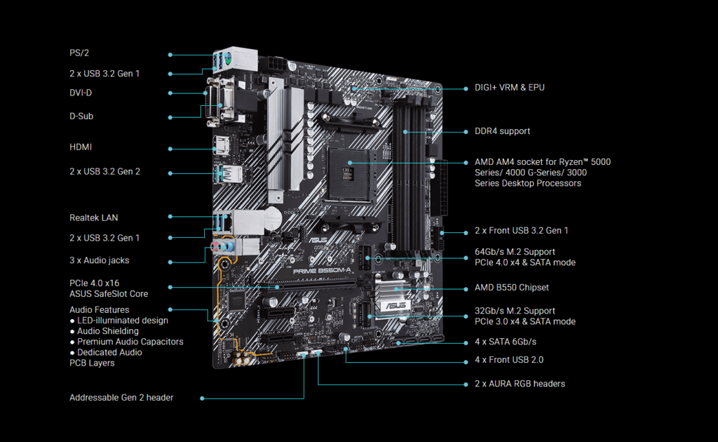 Featuring four DDR4 memory slots, the B550M-A allows up to 128GB of RAM, making it ideal for multitasking and demanding workloads. ASUS engineering, stable power delivery, and an intuitive UEFI BIOS ensure consistent performance and system stability over long-term use.