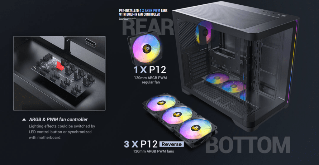 Out of the box, the case includes four pre-installed 120 mm ARGB fans, giving you vibrant lighting and strong airflow from day one. The ARGB lighting can be customized via the built-in control button or synchronized with compatible motherboard software for unified lighting across your system.