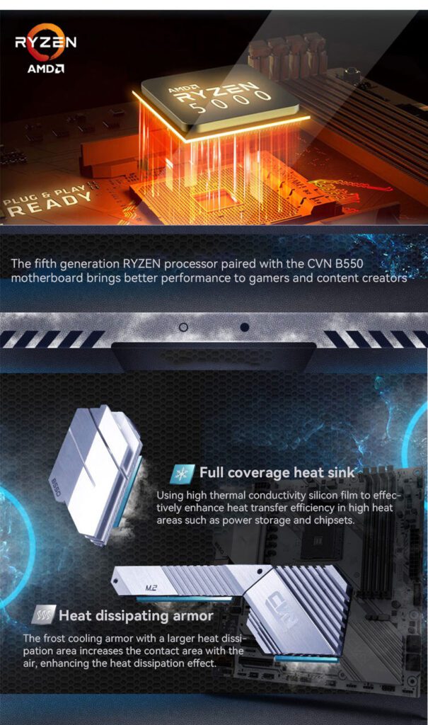 Whether you’re crafting a white-themed PC or a high-performance gaming rig, the CVN B550M GAMING FROZEN V15 offers both beauty and power in one board.