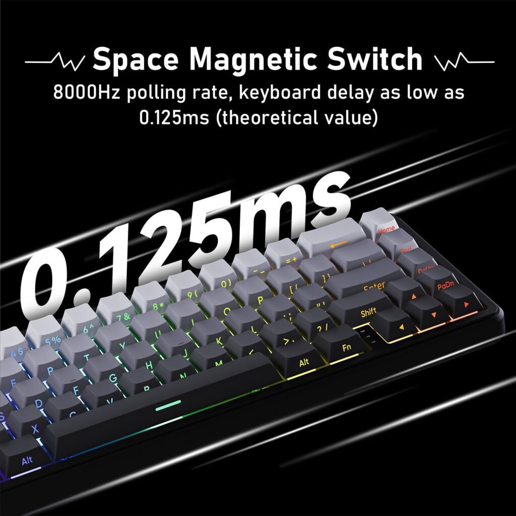 This keyboard is equipped with Rapid Trigger (RT) technology, a game-changing feature for titles like Valorant, CS2, and Apex Legends. It allows keys to reset the instant they are released and reactivate immediately upon being pressed again, regardless of their physical position. This enables near-instantaneous counter-strafing and rapid-fire inputs that are physically impossible on standard mechanical keyboards.