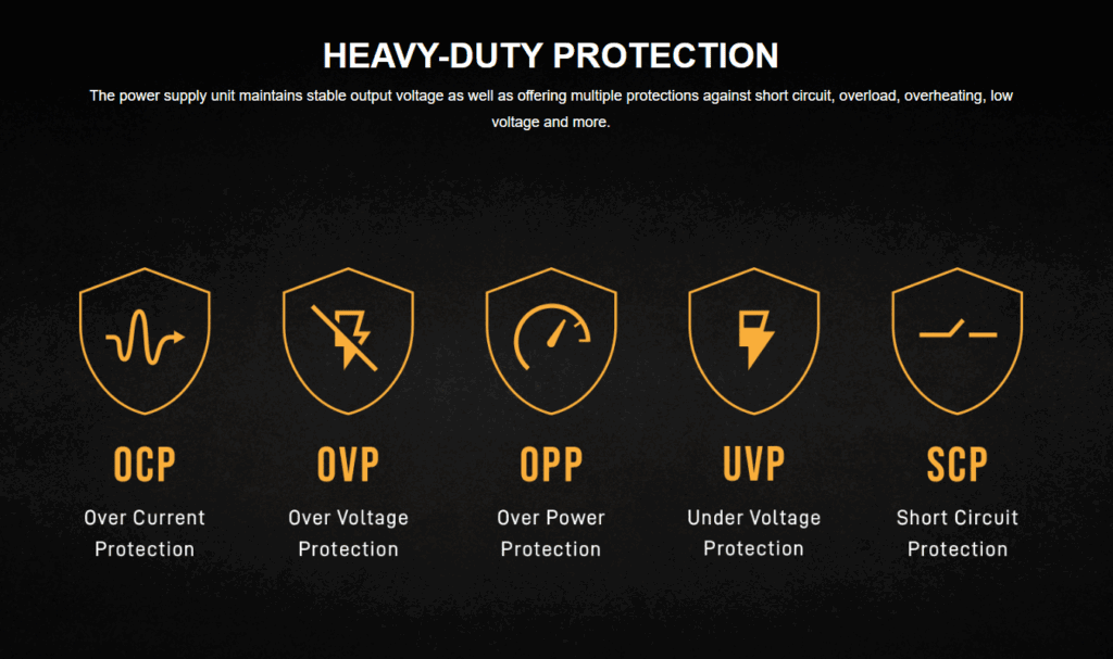 Full suite of protections: OVP, UVP, OCP, OPP, SCP, OTP