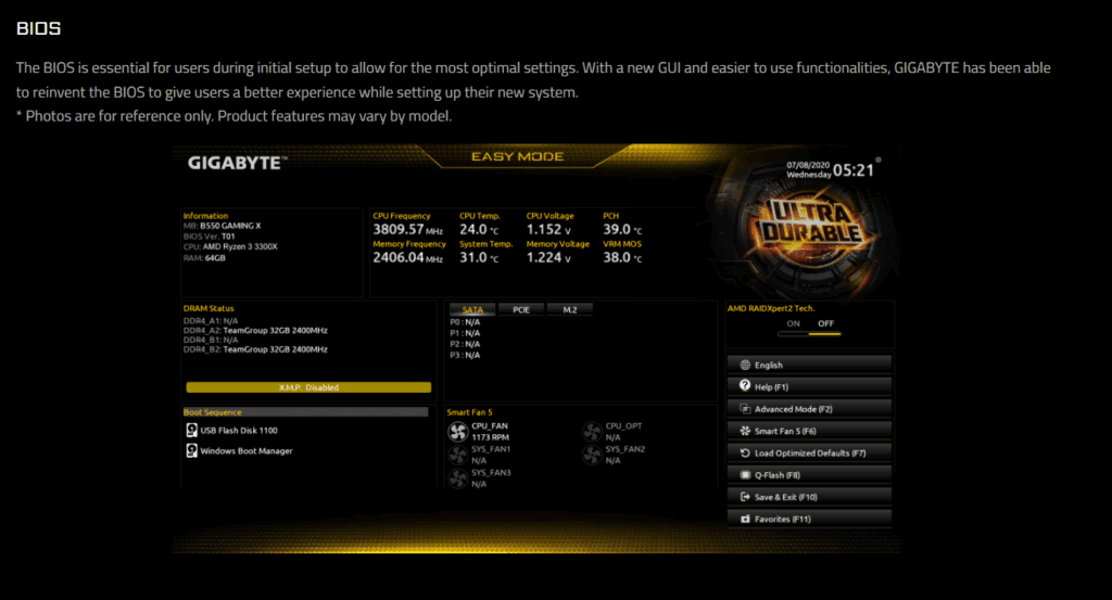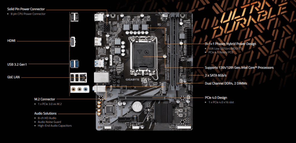 On the rear I/O you’ll find essential connectivity: HDMI output (useful if your CPU has integrated graphics), multiple USB ports, and Gigabit Ethernet for wired networking. The board also incorporates GIGABYTE’s durability features such as Anti-Sulfur resistors and Audio Noise Guard, ensuring a stable experience.