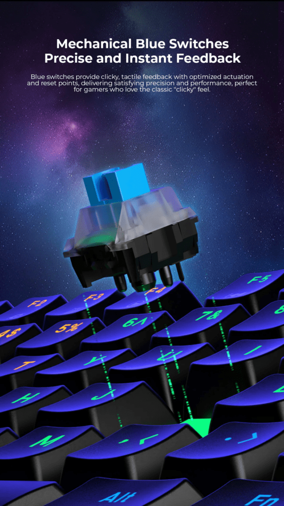 Tactile Blue Mechanical Switches: Delivers a satisfying “clicky” sound and tactile feedback for precise gaming and typing.