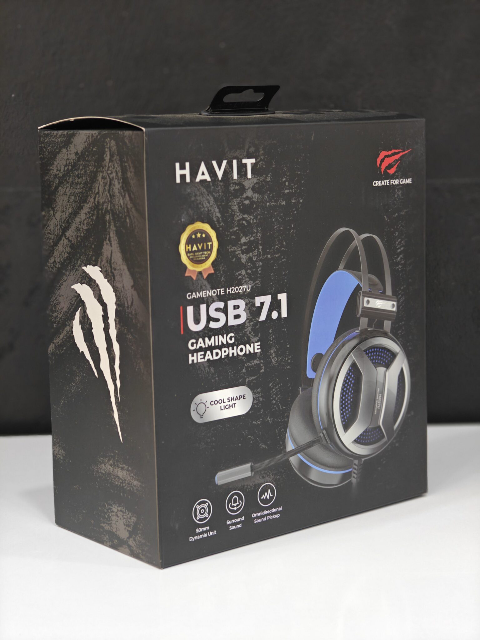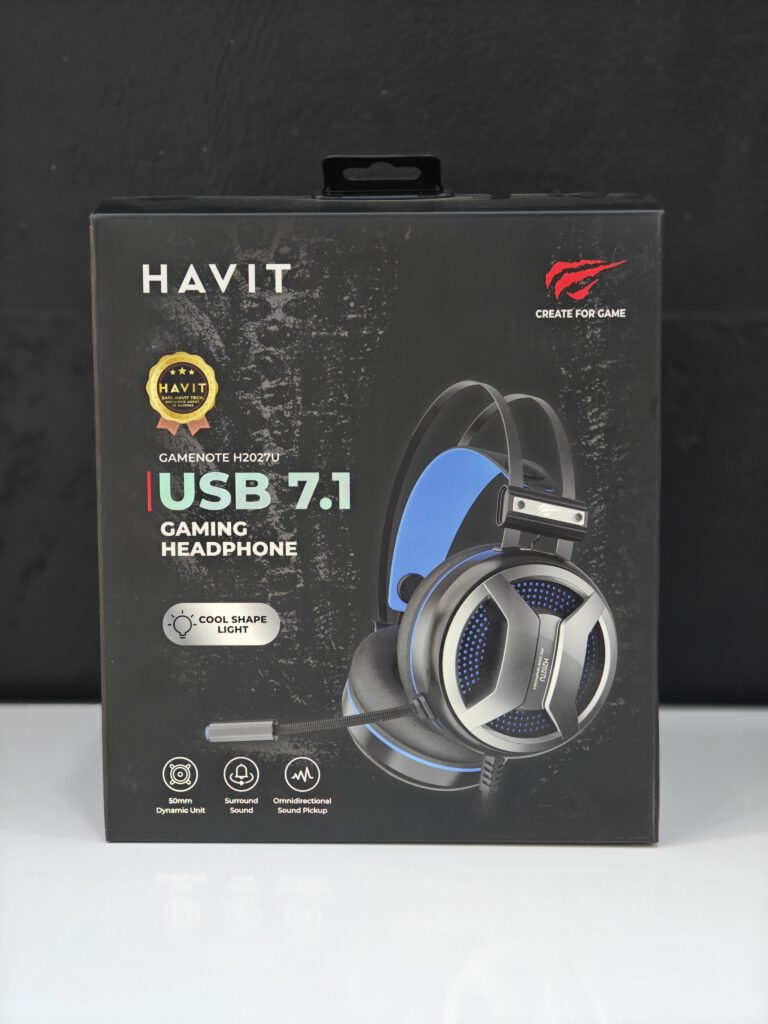 “HAVIT H2027U – RGB gaming headset with 50mm surround drivers, noise-cancelling mic, and USB-powered plug-and-play performance.”
