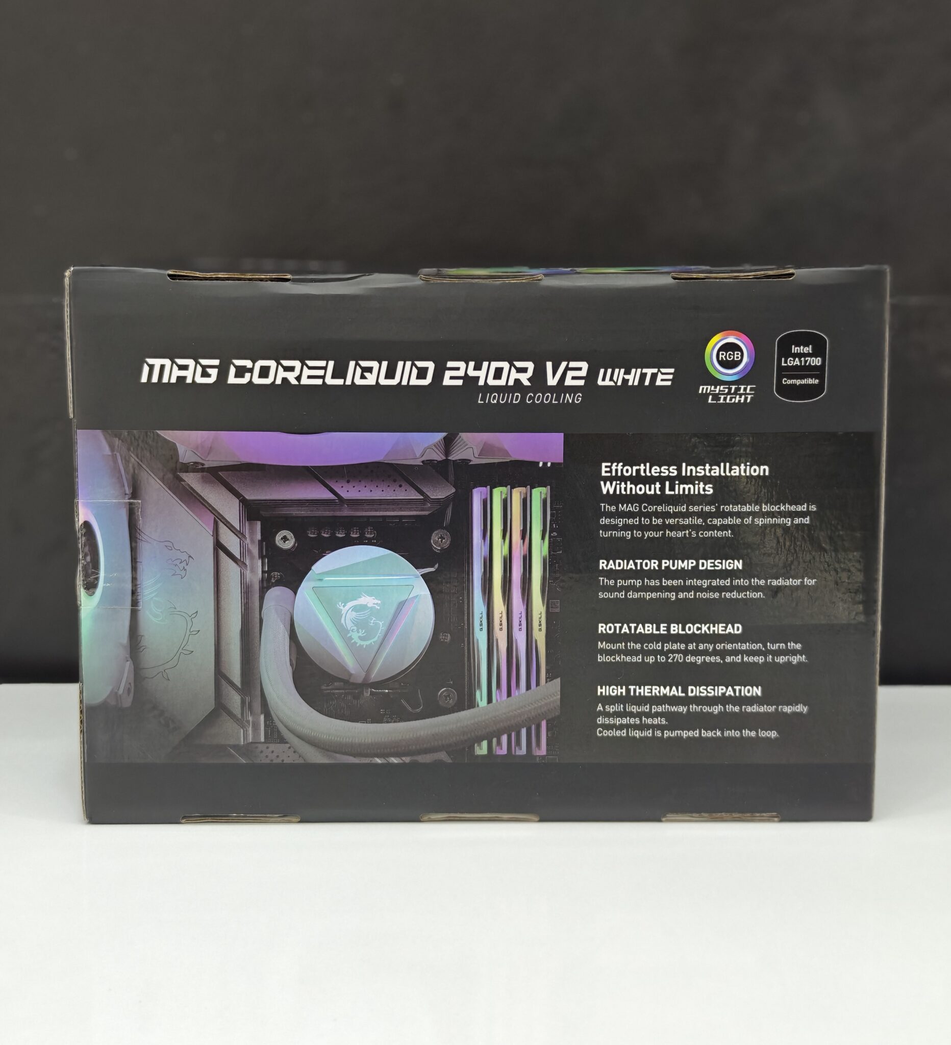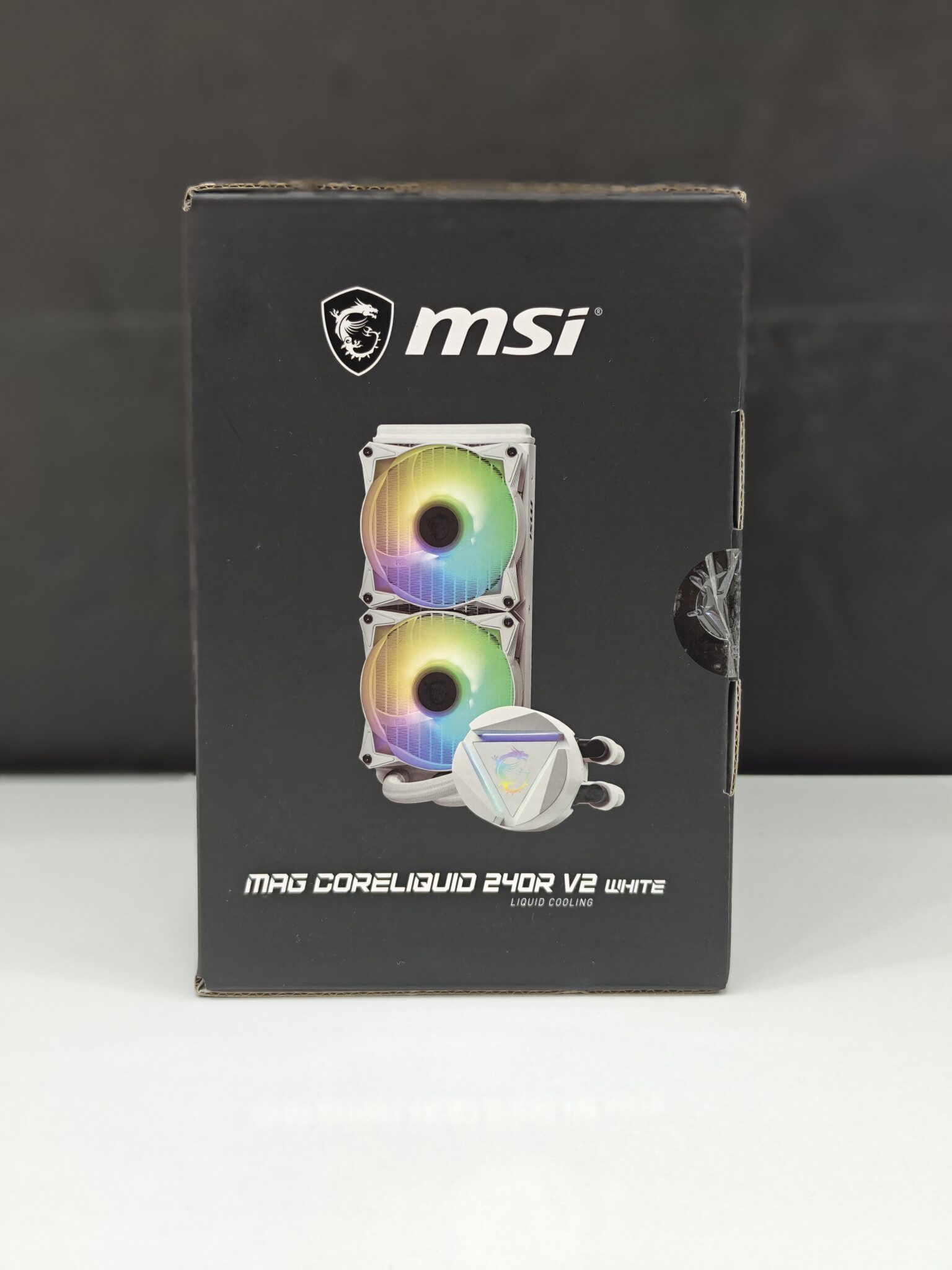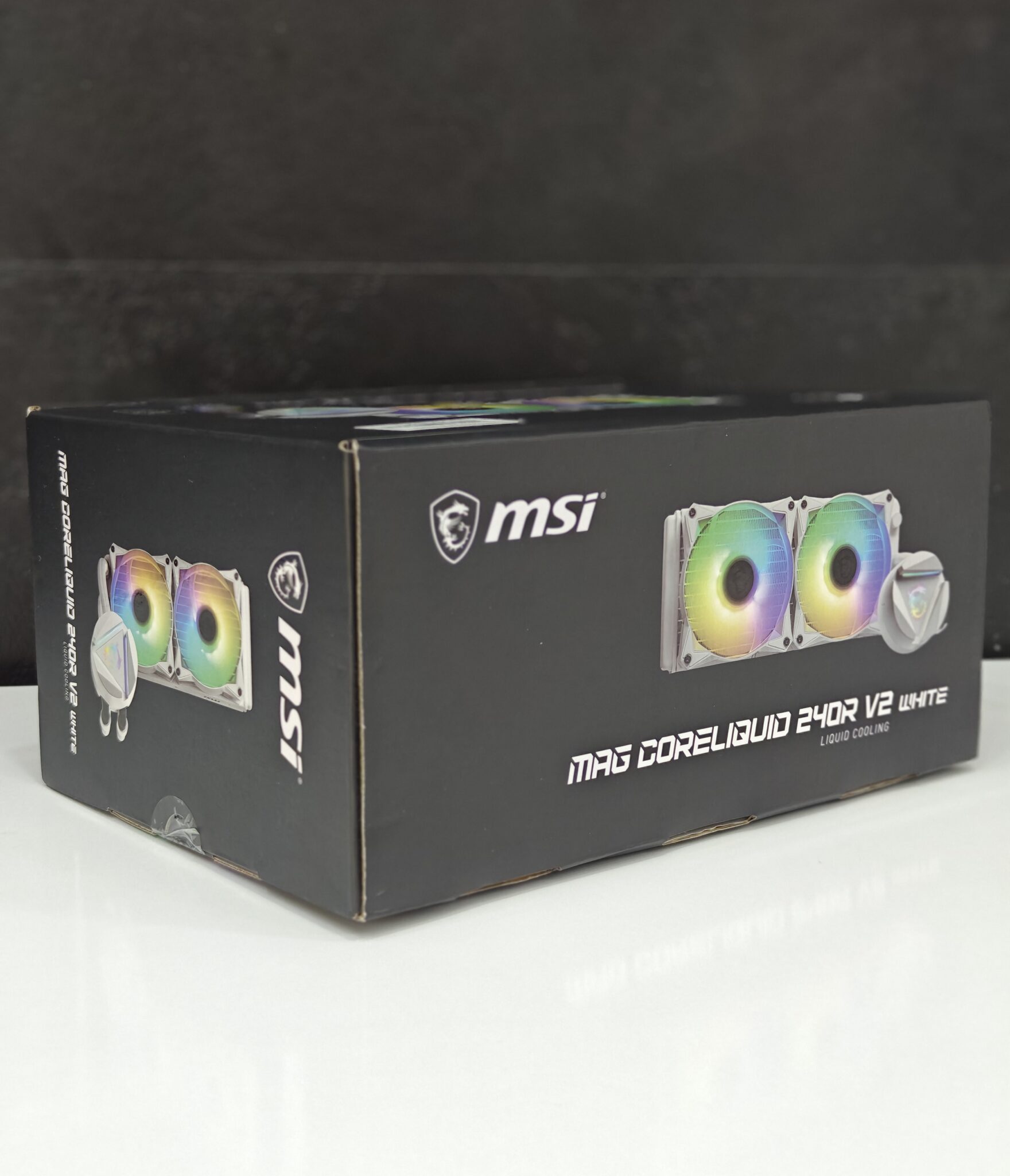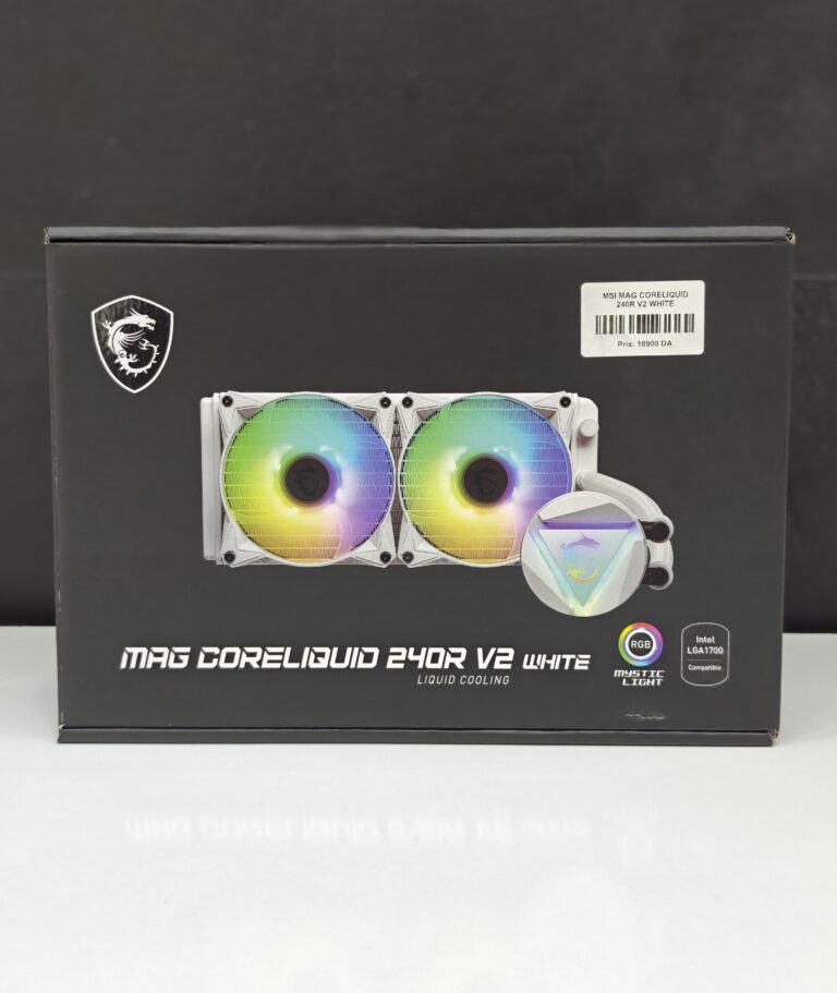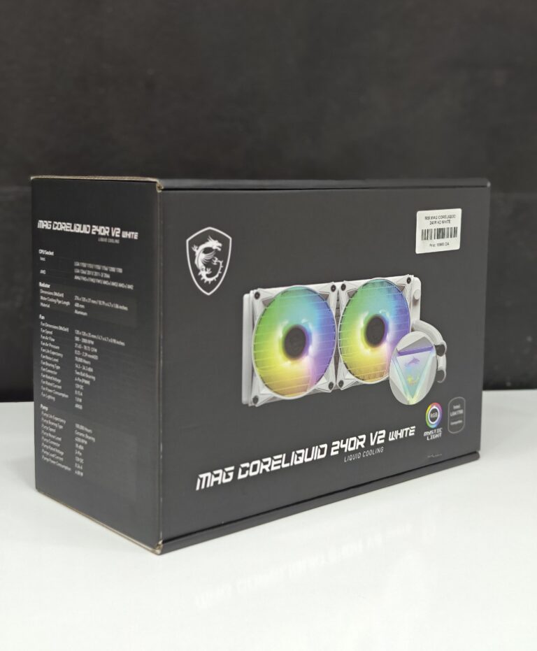 “MSI MAG CoreLiquid 240R V2 WHITE — 240mm ARGB AIO, dual 120mm PWM fans, 270° rotatable block, low vibration, Intel/AMD sockets ready.”