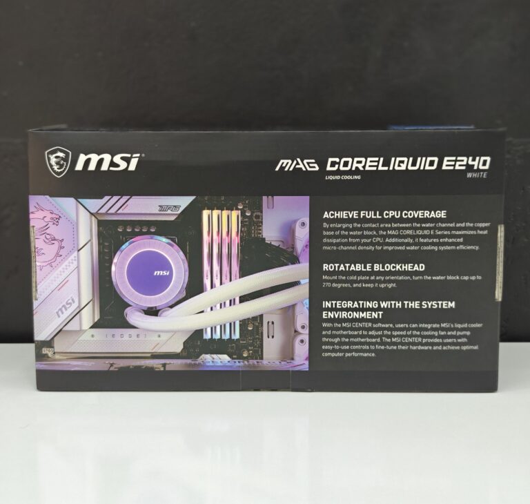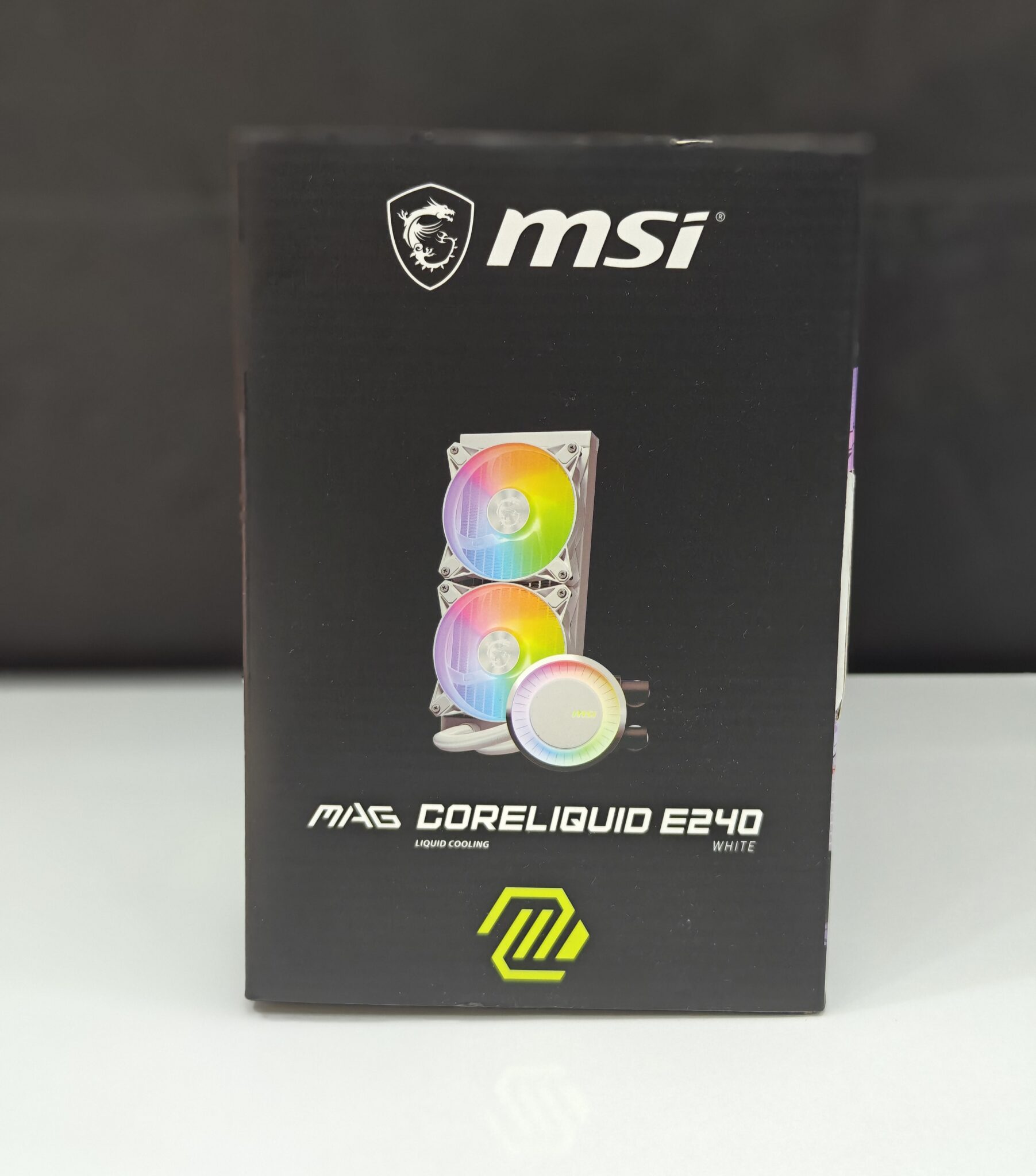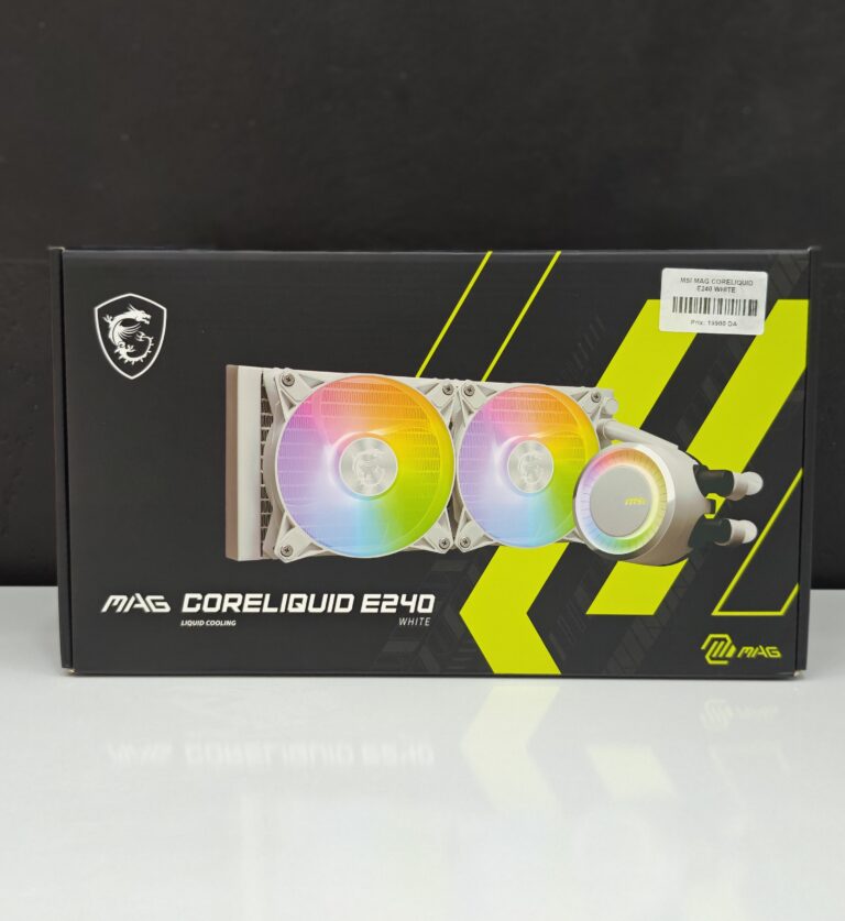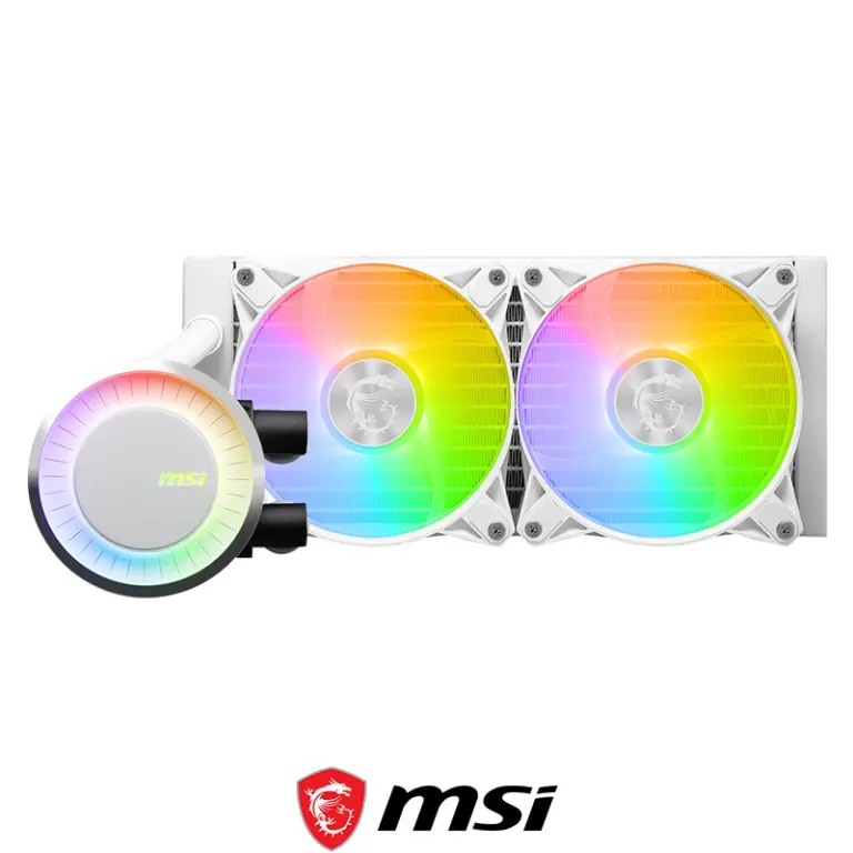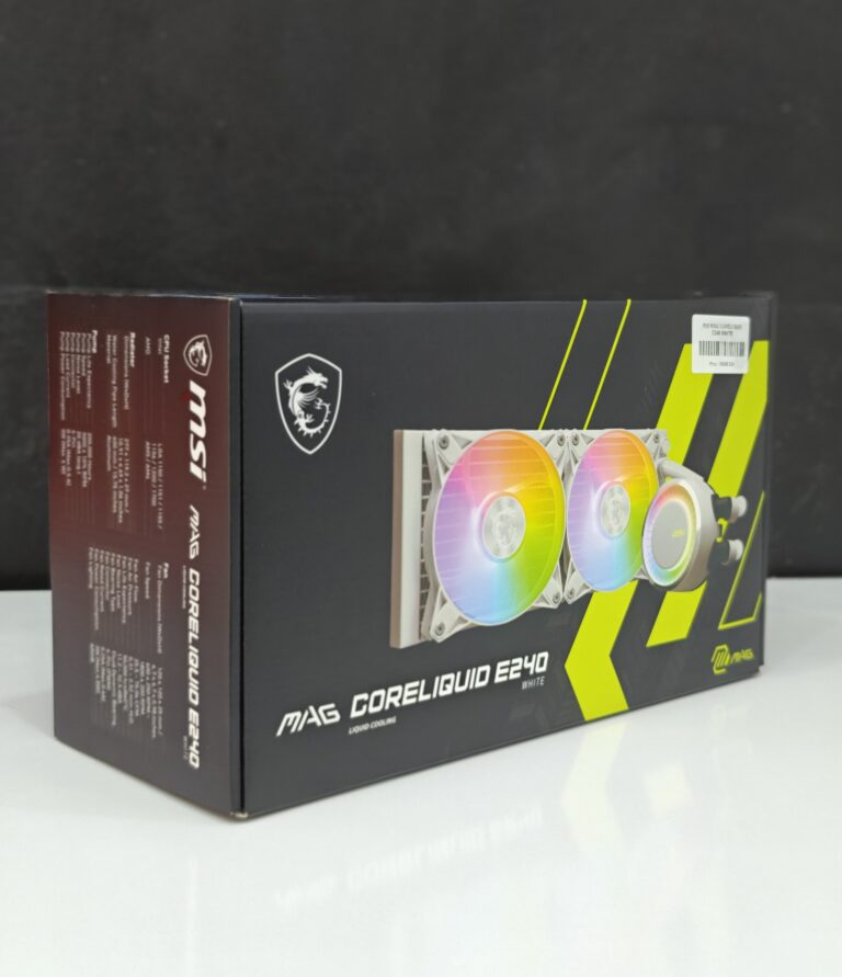 “MSI MAG CORELIQUID E240 WHITE – 240 mm ARGB AIO cooler with dual 120 mm FDB fans, rotatable block, broad Intel/AMD socket compatibility, quiet operation.”