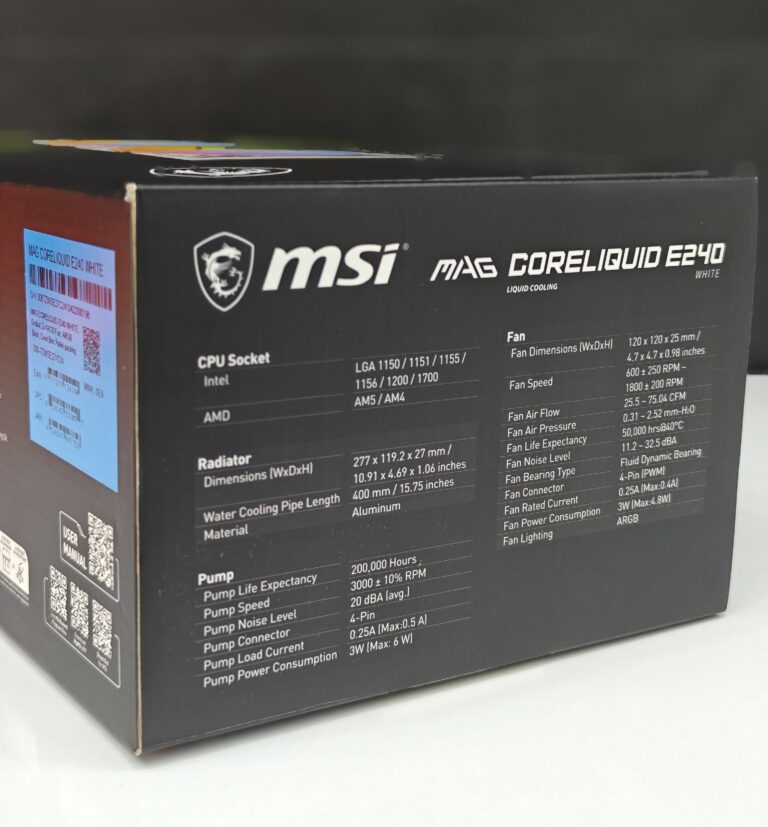 The MSI MAG CORELIQUID E240 WHITE brings high-performance cooling and eye-catching style to your build. With a 240 mm radiator and dual ARGB fans, it’s capable of efficiently handling heat from high-end CPUs without overwhelming noise. The pump is quietly integrated, and the blockhead’s 270° rotation ensures you can align cables neatly in your case.The fans are designed to project airflow between 25.5 and 75.0 CFM, using fluid dynamic bearings for durability. With life expectancy ratings of 50,000 hours for the fans and 200,000 hours for the pump, reliability is built in. Its compatibility spans both Intel’s and AMD’s latest platforms, including LGA 1700 and AM5. Paired with the sleek white finish and customizable ARGB lighting, this cooler is as visually striking as it is functional.