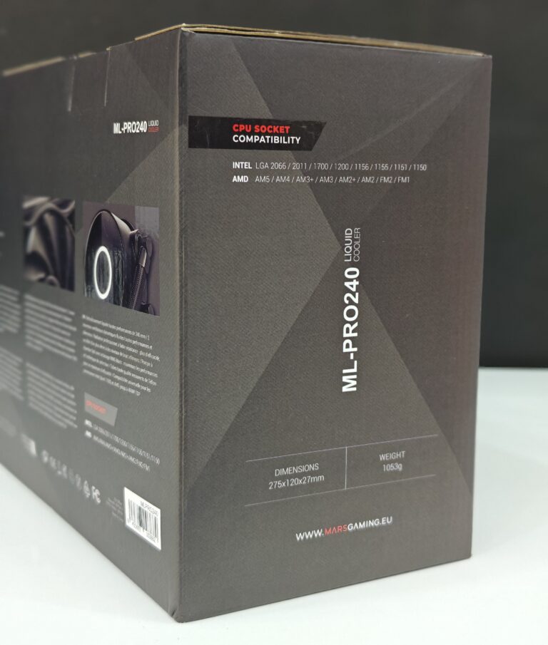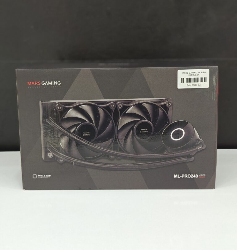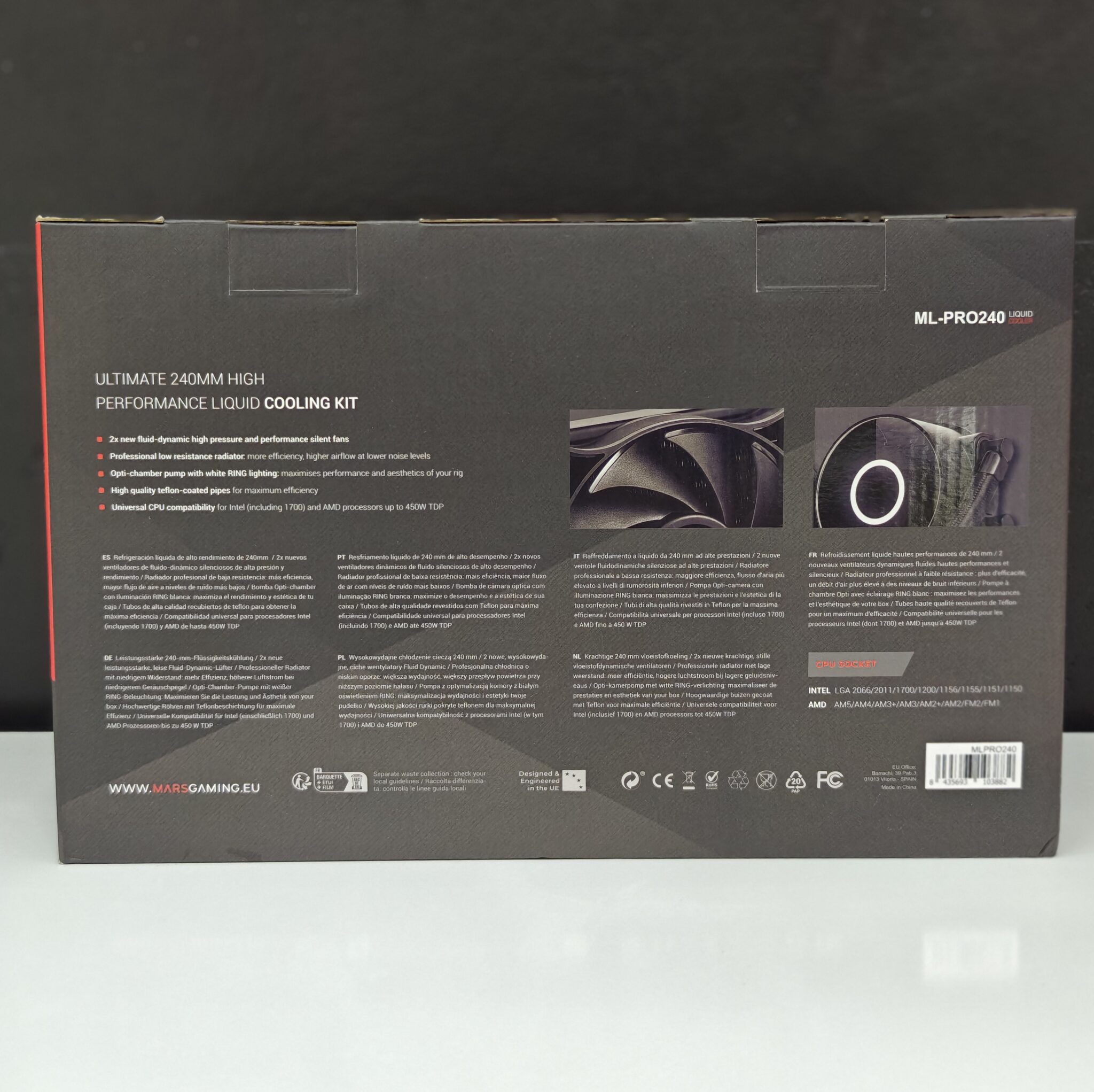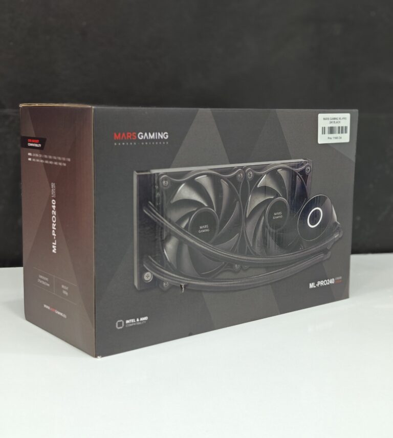 “Mars Gaming ML-240 – 240 mm ARGB liquid cooler, ~400-500 W TDP, extra-long tubing, wide socket support, strong airflow with dual 120 mm FDB fans.”