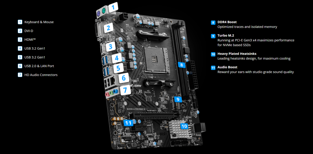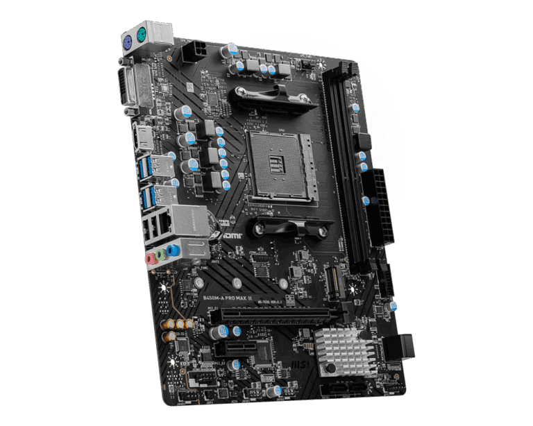 “MSI B450M-A PRO MAX II – Micro-ATX AM4 motherboard with Ryzen 1000–5000 support, DDR4 up to 4133MHz, M.2 slot, and solid VRM performance.”