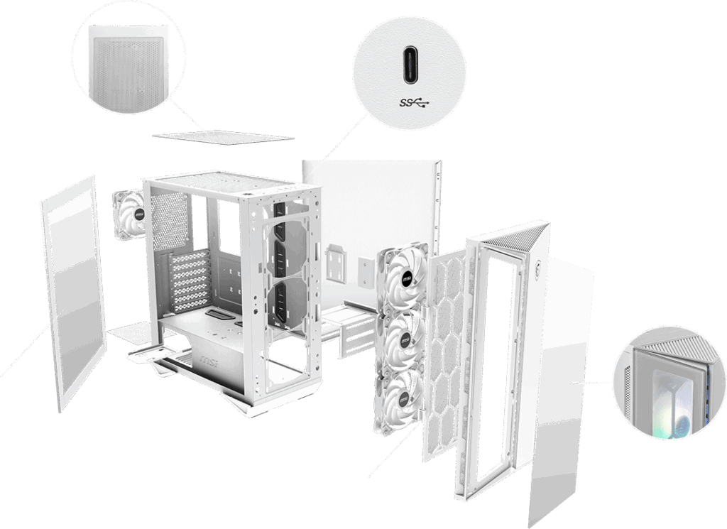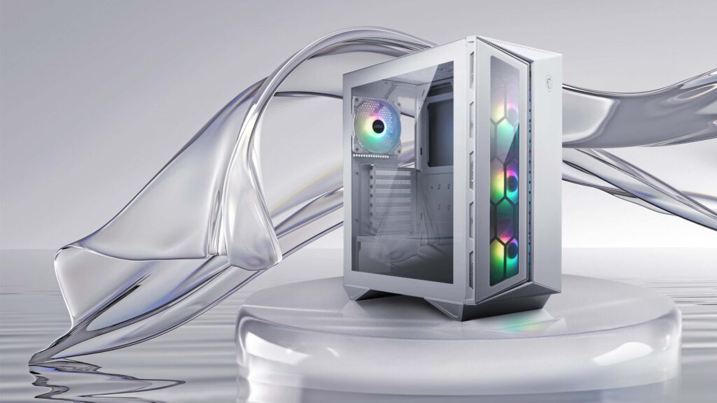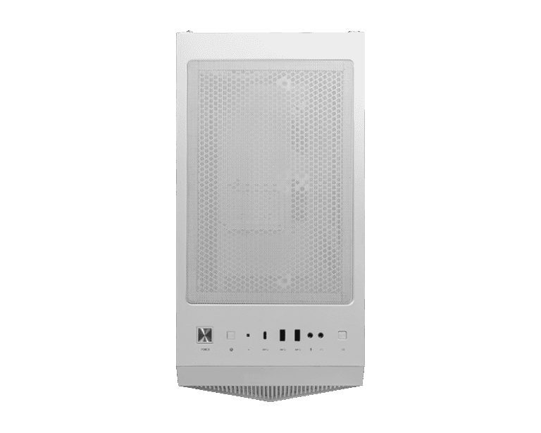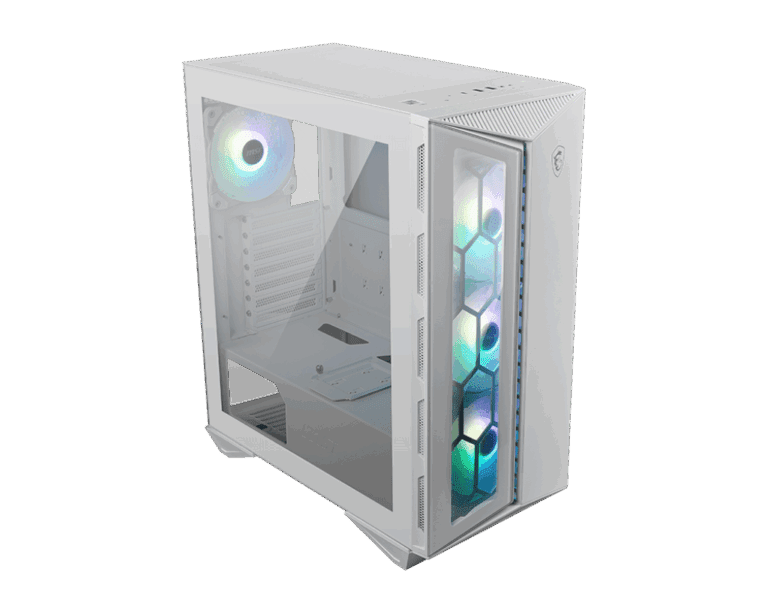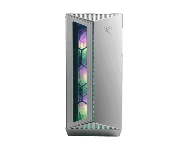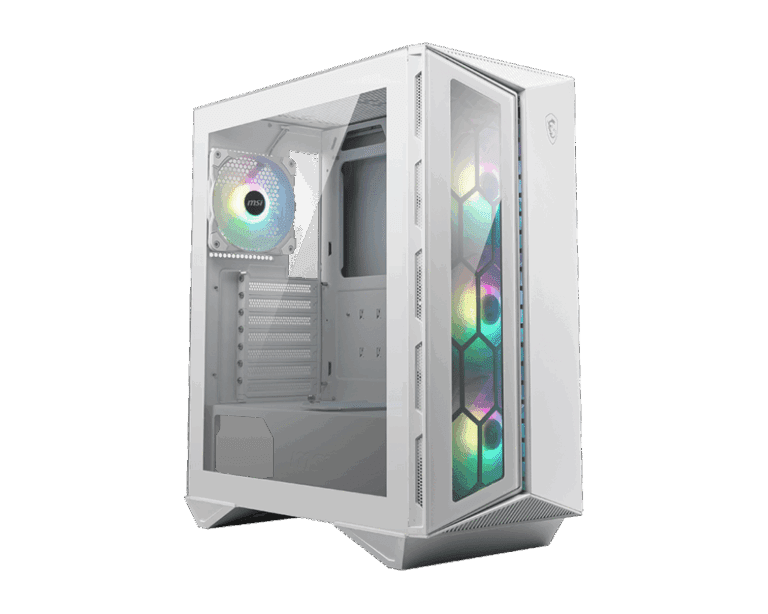 The MSI MPG GUNGNIR 110R WHITE combines elegant aesthetics with exceptional performance and airflow. Its prism-shaped front panel gives a striking, modern look, while the tempered-glass side panel lets you showcase your components in style.
