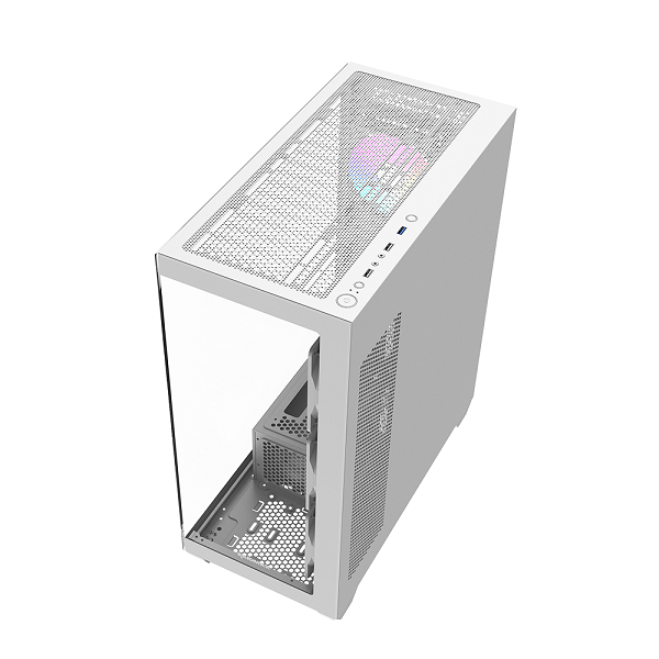 Stylish white mid-tower gaming case with chrome-mirror tempered-glass front and ARGB cooling support — designed for showcase builds and high-performance hardware.