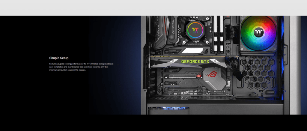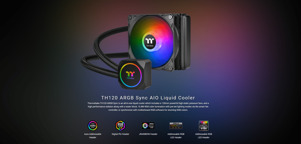 "The Thermaltake TH120 ARGB Sync is a high-performance 120mm AIO that combines space-saving design with vibrant, synchronized ARGB lighting for elite-tier cooling."