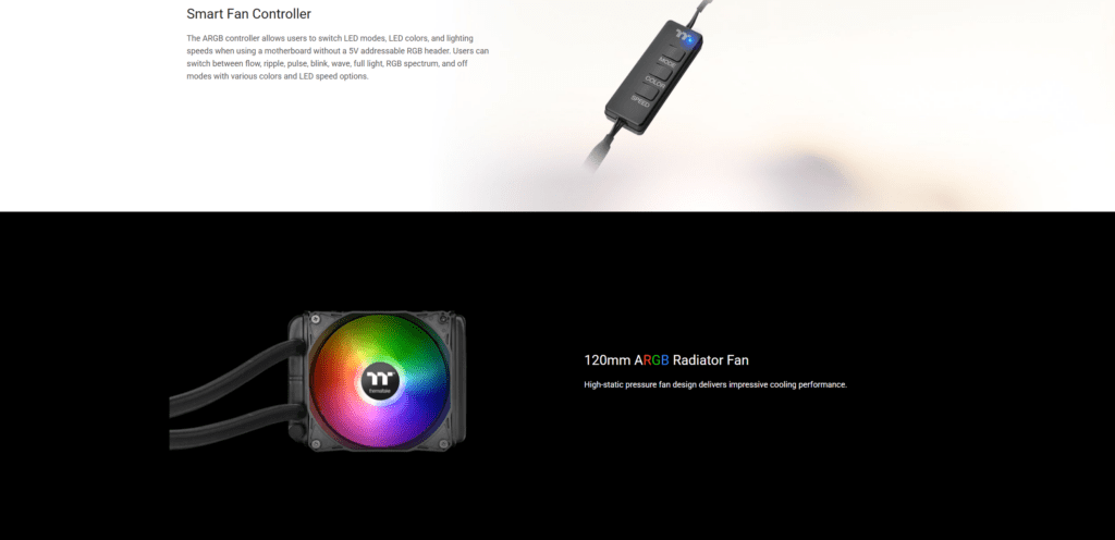 Equipped with a 120mm high-static pressure ARGB fan, the TH120 delivers powerful airflow while adding a vibrant visual element to your build. The addressable RGB lighting on both the fan and the water block can be synchronized with 5V ARGB-capable motherboards from major brands like ASUS, Gigabyte, MSI, and ASRock. For systems without an ARGB header, the cooler includes a smart fan controller, allowing you to switch between various lighting modes, colors, and speeds manually.