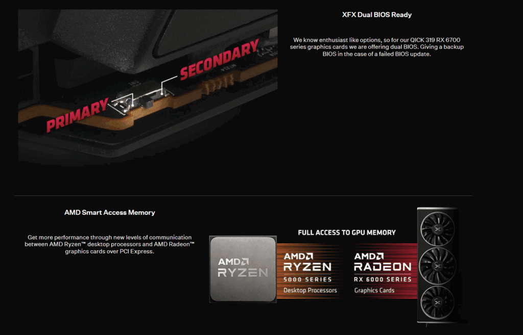 The XFX SPEEDSTER QICK 319 RX 6700 XT is designed to deliver high-end gaming performance and superb cooling efficiency. Based on AMD’s powerful RDNA 2 architecture, this card brings enhanced gaming realism with real-time ray tracing, variable rate shading, and support for DirectX 12 Ultimate.