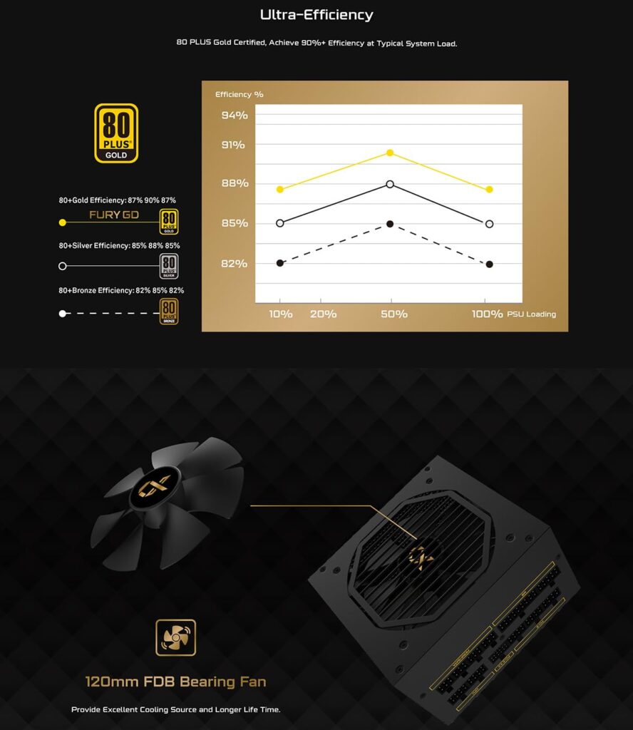Efficiency is a standout feature, as the Fury GD carries an 80 Plus Gold certification, guaranteeing up to 90% energy efficiency under typical loads. This translates to less heat generation, lower electricity costs, and quieter operation. Internally, the PSU utilizes 100% Japanese capacitors and a DC-to-DC converter design to ensure tight voltage regulation and minimal ripple, protecting your delicate internal hardware from power fluctuations.